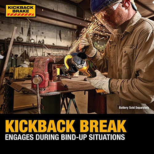Details: This brushless small cordless angle grinder requires no time changing brushes, and offers a longer motor life. DEWALT cordless grinder offers a high level of protection. Its break stops the wheel in 2 seconds or less. The Kickback Break engages maximum force to stop the wheel when there is a pinch, stall, or bind-up to reduce kickback. The grinder will also shut off in those events to further protect the user. Battery and charger are sold separately.
